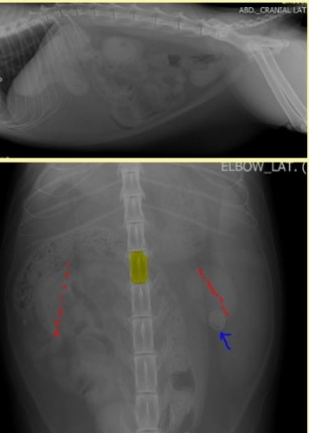 - 때때로 초음파에서는 에코 증가(echogenic) 병소와 섀도(shadowing)가 동반됨. (Small Animal Ultrasonography)